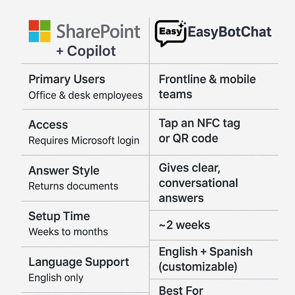 Why SharePoint + Copilot Falls Short for Frontline Teams — and How EasyBotChat Delivers Real Answers Faster
