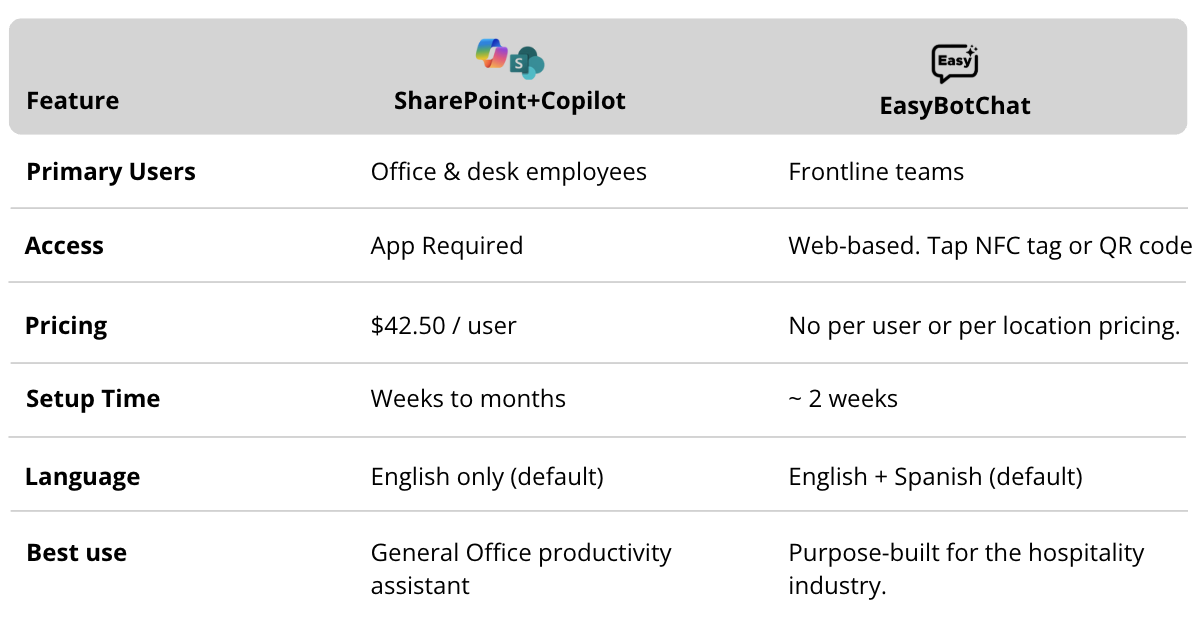 SharePoint + Copilot might be fine for your corporate office, but EasyBotChat was built for your frontline workforce—the teams that actually deliver your brand experience every day.